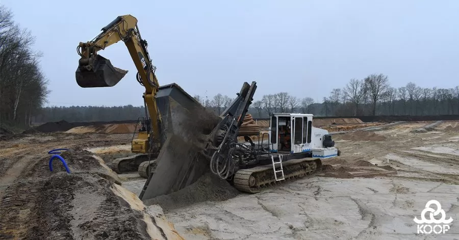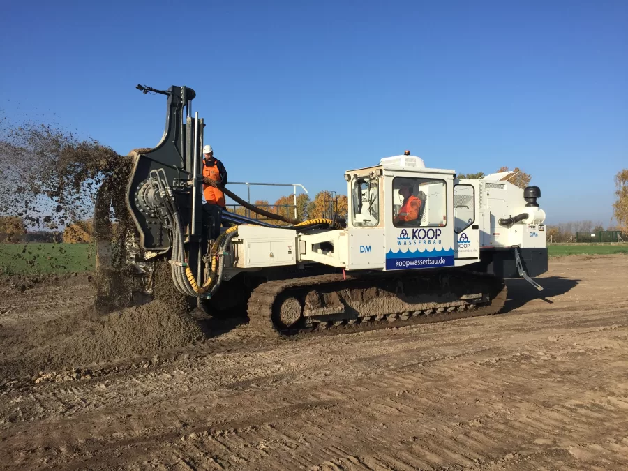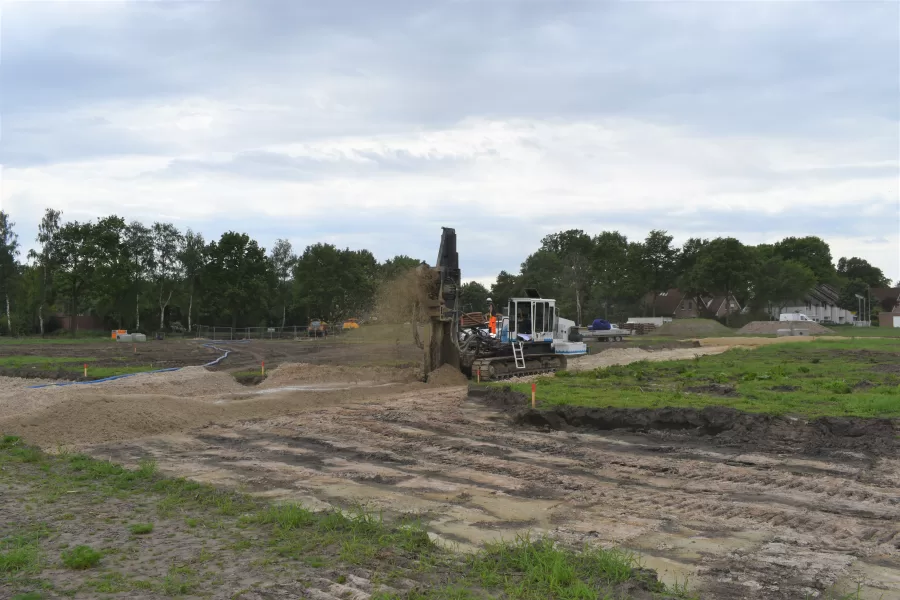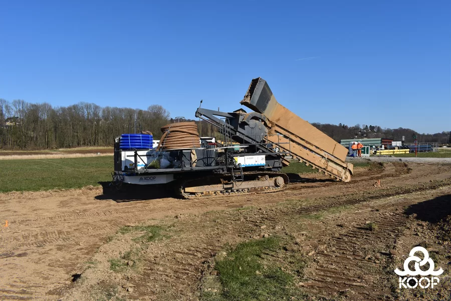 For the development of large construction areas and long cable and pipeline routes, groundwater lowering via horizontal dewatering is a very effective method. With our drainage machines, a milling depth of up to 7.80 m below the ground surface can be achieved. To allow groundwater inflow in soils that are difficult to drain, the drainage trench is filled with drainage sand via a gravel funnel.